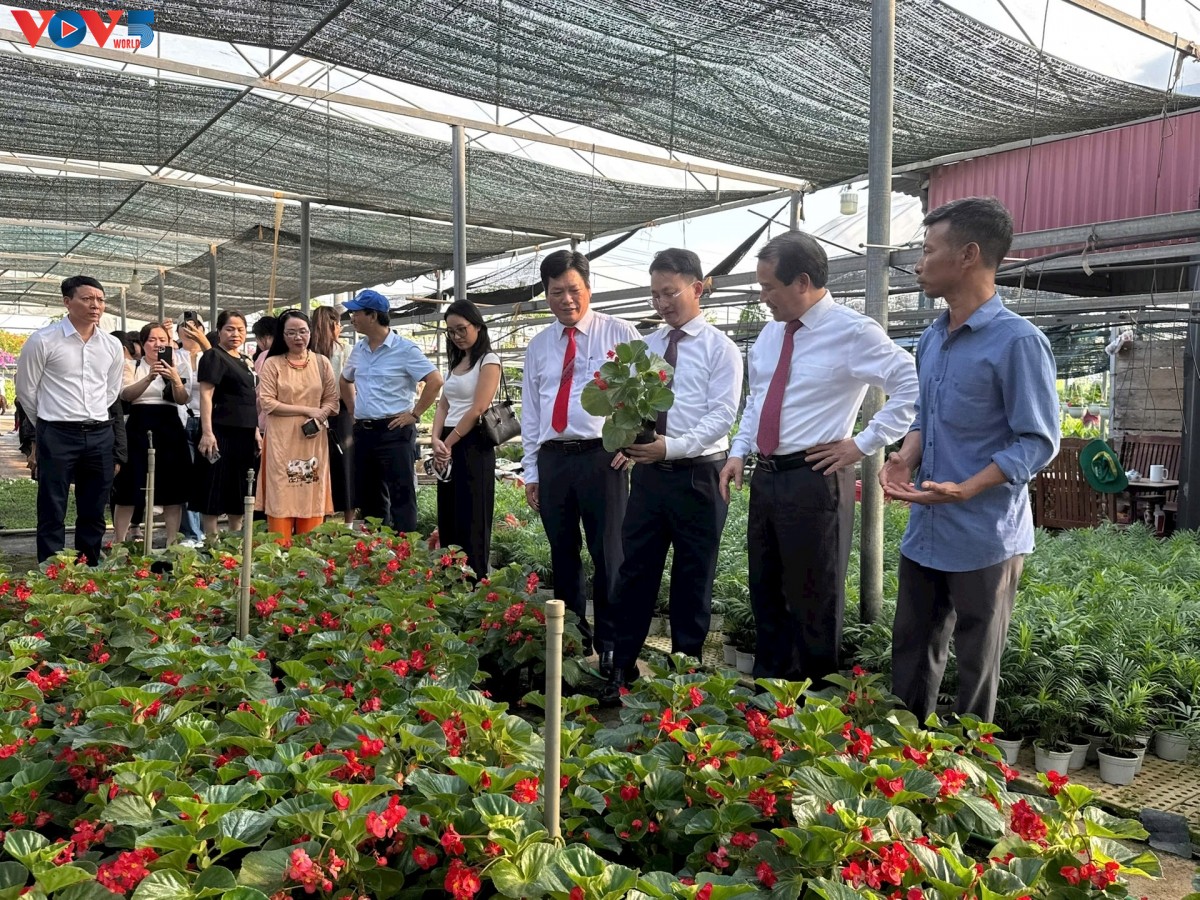Eine Delegation informiert sich über das Blumen- und Zierpflanzendorf Tich Giang in der Gemeinde Phuc Tho. (Foto: Hong Hanh) |