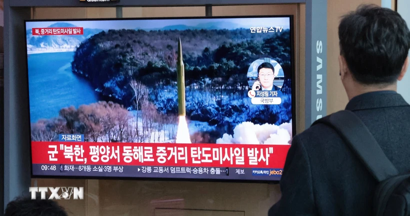 Südkoreas Fernsehsender berichtet über den Start einer ballistischen Mittelstreckenrakete Nordkoreas in Seoul am 2. April 2024. (Foto: Yonhap/VNA) |