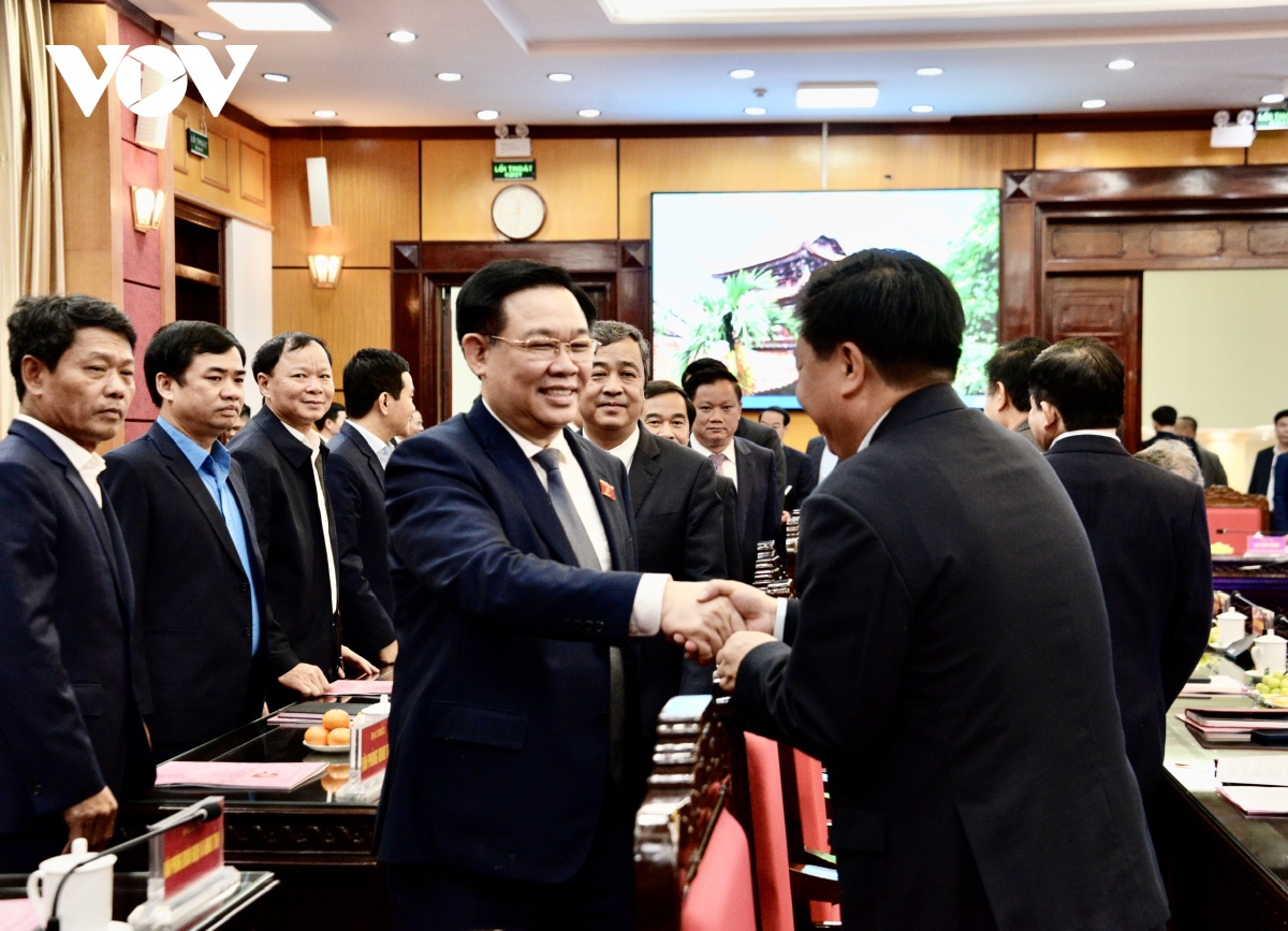 Parlamentspräsident Vuong Dinh Hue beim Treffen mit Verwaltern der Provinz Thai Binh. |