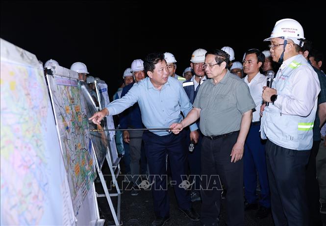 Der Premierminister überprüft das Projekt der Autobahnbau. (Foto: Duong Giang/VNA) |