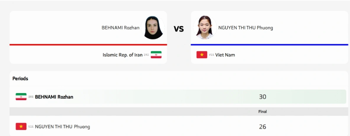 Im Kampfsport Muay Thai trat Nguyen Thi Thu Phuong im Finale der Frauenklasse im Alter zwischen 14 und 15 Jahren gegen ihre iranische Gegnerin, Rozhan Behnami, an. Nach 3 Runden verlor Thu Phuong nach einstimmiger Entscheidung des Schiedsrichterteams mit 26:30 und gewann die Silbermedaille.