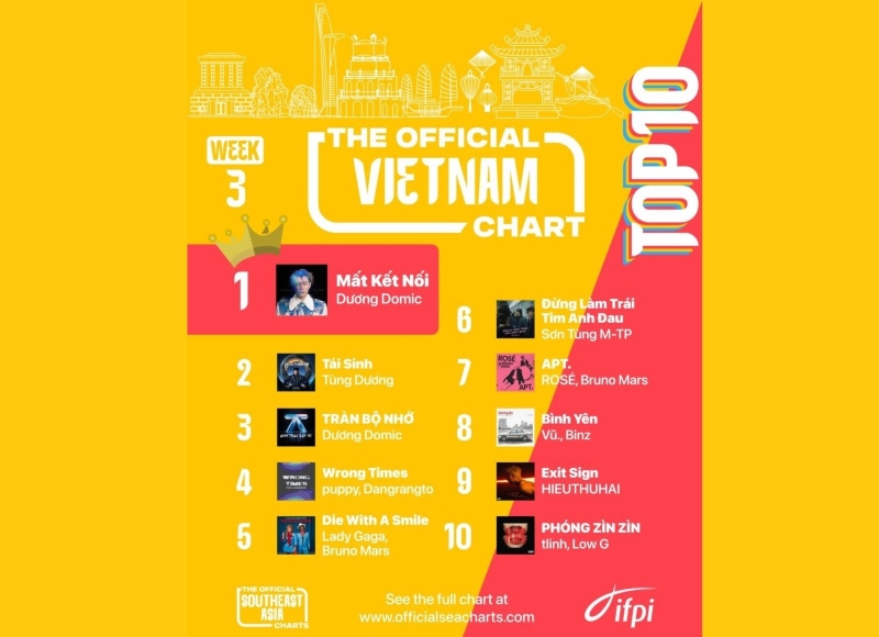 Laut dem Verband werden die Ergebnisse der offiziellen vietnamesischen Charts aus dem Streaming auf beliebten globalen Plattformen im Allgemeinen und in Vietnam im Besonderen kombiniert, wie etwa: Apple Music, Deezer, Spotify und YouTube. Diese Musikcharts werden jeden Dienstag bekannt gegeben.