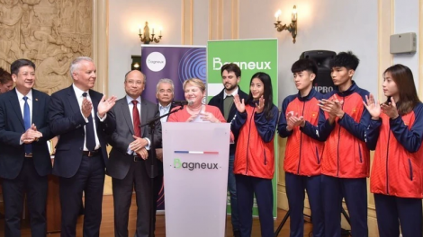 Die Bürgermeisterin der Stadt Bagneux begrüßt junge vietnamesische Taekwondo-Kämpfer