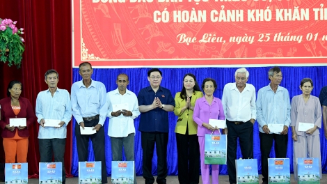 (VOVWORLD) - Anlässlich des bevorstehenden traditionellen Neujahrsfestes Tet hat Parlamentspräsident Vuong Dinh Hue am Donnerstag verdienstvollen Menschen, armen Familien, Agent-Orange-Opfern und Arbeitnehmern aus schwierigen Verhältnissen in der südvietnamesischen Provinz Bac Lieu Geschenke überreicht.