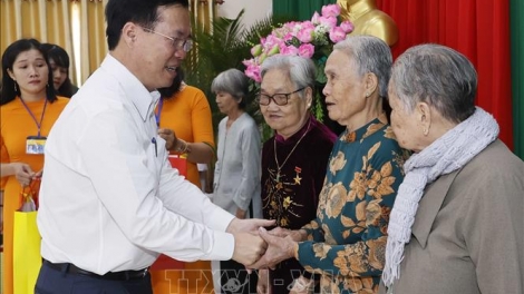 (VOVWORLD) - Zum bevorstehenden Neujahrsfest Tet 2024 hat Staatspräsident Vo Van Thuong am Freitag die Menschen mit Verdiensten, bedürftige Haushalten und Arbeitnehmer im Kreis Tra On in der Provinz Vinh Long besucht.