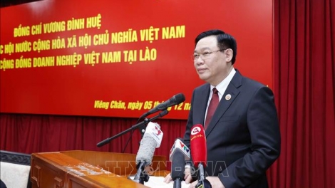 (VOVWORLD) - Während seiner Teilnahme am Gipfeltreffen der Parlamente von Kambodscha, Laos und Vietnam hat Parlamentspräsident Vuong Dinh Hue am Dienstagnachmittag die Vertreter der vietnamesischen Unternehmen in Laos getroffen.