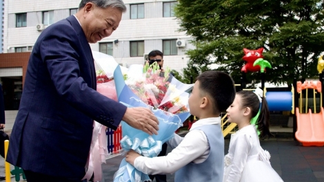 (VOVWORLD) - Während seines Besuchs in Nordkorea hat KPV-Generalsekretär To Lam am Donnerstag den Kindergarten Gyeongsang und das Klassenzimmer, das den Namen von Präsident Ho Chi Minh trägt, besucht.