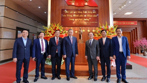 (VOVWORLD) - KPV-Generalsekretär To Lam hat am Samstag den Hauptsitz des Radiosenders „Die Stimme Vietnams“ (VOV) in Hanoi besucht und VOV-Mitarbeiter zum bevorstehenden traditionellen Neujahrsfest Tet beglückwünscht.
