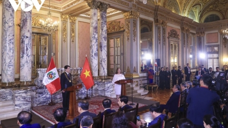 (VOVWORLD) - Nach dem offiziellen Gespräch und der Zeremonie zur Ordensverleihung haben der vietnamesische Staatspräsident Luong Cuong und die peruanische Präsidentin Dina Boluarte eine Pressekonferenz abgehalten.