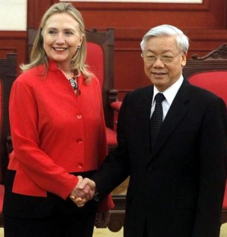 | Die ehemalige US-Außenministerin Hillary Clinton trifft KPV-Generalsekretär Nguyen Phu Trong bei ihrem Vietnambesuch im Juli 2012. |