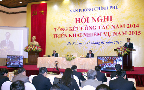 | Premierminister Nguyen Tan Dung hält seine Rede auf der Konferenz zur Umsetzung der Aufgaben des Regierungsbüros im Jahr 2015. (Foto: Thanh Chung) |