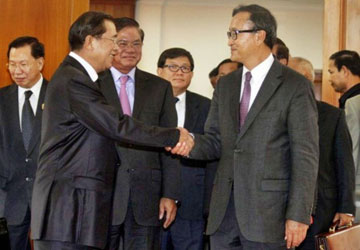 | Premierminister Hun Sen (l.) und der Präsident der oppositionellen Partei zur Nationalrettung (CNRP) Sam Rainsy beim Treffen am Montag. (Foto: Reuters/phapluat.vn) |