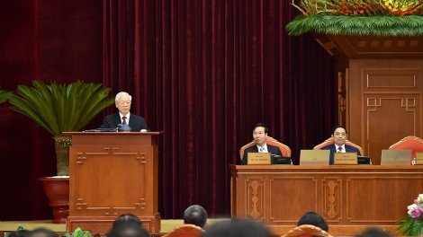 (VOVWORLD) - Die 3. Sitzung des ZK der 13. Amtsperiode der kommunistischen Partei Vietnams findet derzeit in Hanoi statt. Die ZK-Mitglieder diskutieren über wichtige Themen und Probleme des Landes wie den Fünfjahresplan der sozialwirtschaftlichen Entwicklung bis 2025. KPV-Generalsekretär Nguyen Phu Trong hielt eine Rede bei der Eröffnung der ZK-Sitzung.