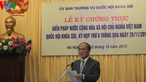 (VOVworld) – Auf der jüngsten Sitzung hat das Parlament mit 97,59 Prozent die erneuerte Verfassung der Sozialistischen Republik Vietnam verabschiedet. Parlamentspräsident Nguyen Sinh Hung hat vor kurzem die erneuerte Verfassung, die am 1. Januar 2014 in Kraft treten wird, unterzeichnet.