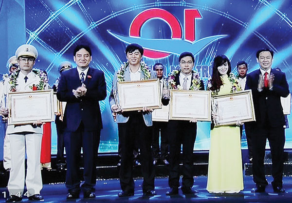 | Phan Thanh Sang (3.v.l.) bekommt den Preis "Hervorragende Jugendliche 2015". (Foto: baolamdong.vn) |