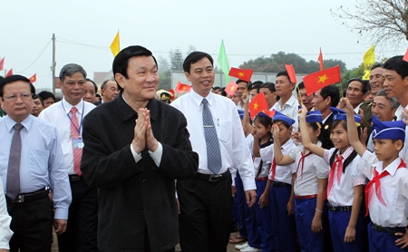 | Staatspräsident Truong Tan Sang bei seinem Besuch in der Gemeinde Vinh Thach. (Foto: VNA) |