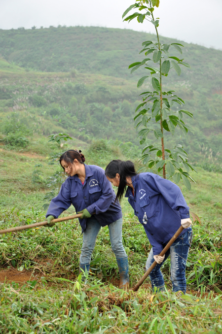| Arbeiterinnen der Kautschuk-Firma Yen Bai pflegen 2-jährige Kautschukbäume. (Foto: baoyenbai.com.vn) |