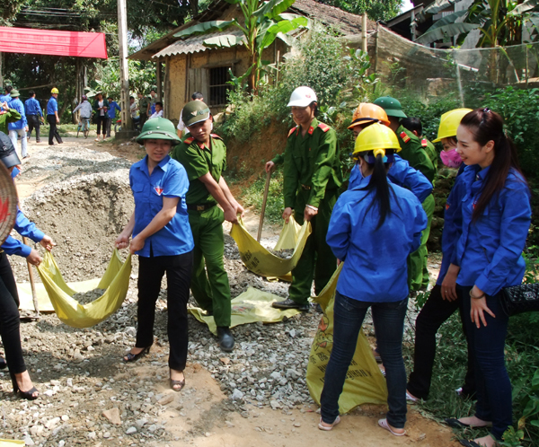 | Mitglieder des Jugendverbands und Soldaten beteiligen sich an Straßenbau in Muong Khuong. (Foto: laocai.gov.vn) |