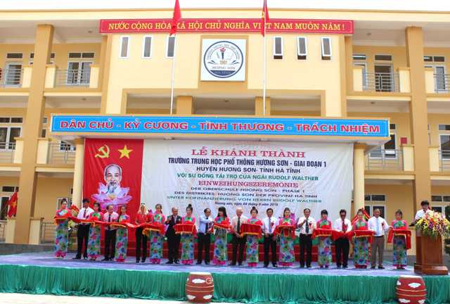 | Vertreter der Behörden in Ha Tinh und der deutschen Delegation beim Durchschneiden des Eröffnungsbandes der Oberschule Huong Son. (Foto: Hessenbüro) |