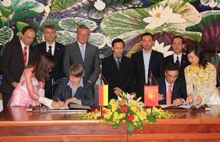 | Die deutsche Botschafterin in Vietnam Jutta Frasch (l.) bei der Unterzeichnung einer Finanzvereinbarung mit Vietnam. (Foto: dantri.com.vn) |
