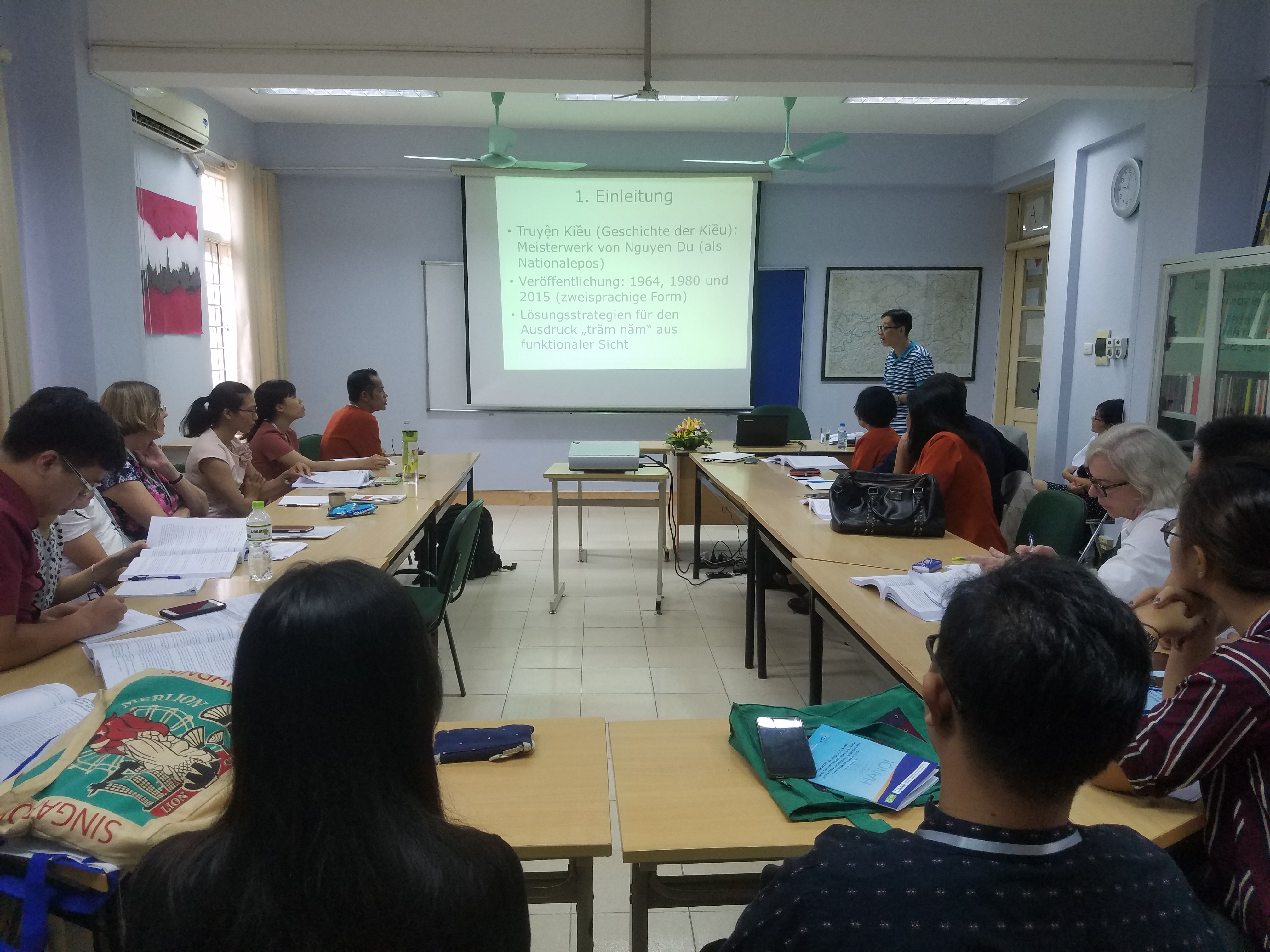 (VOVWORLD) - “Truyen Kieu”, auf Deutsch “Das Mädchen Kieu” des Dichters Nguyen Du ist ein klassischer Versroman der vietnamesischen Literatur. Er wurde in mehr als 20 Fremdsprachen, darunter in Deutsch. Das bekannte Übersetzer-Paar Franz und Irene Faber sind die jenigen, die dieser berühmter Versroman Vietnams den deutschen Leser übermittelt haben. Doktor Le Hoai An der Fremdsprachenhoschschule der Nationaluniverstität Hanoi hat vor kurzem im Rahmen des internationalen Seminars mit dem Motto “International, Interkulturell, Interdisziplinär: DAF in Zeiten der Globalisierung” einen Vortrag über die Übersetzungsmethode der Wörter “Tram nam” in der Nachdichtung von “Das Mädchen Kieu” gehalten.