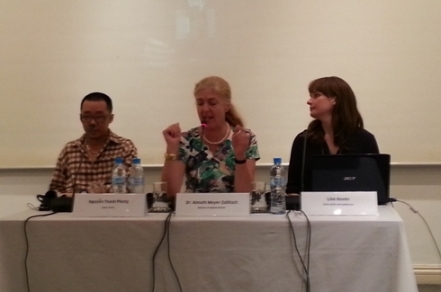 | Comiczeichnerin Line Hoven (r.) und Maler Nguyen Thanh Phong (l.) auf dem Forum. |