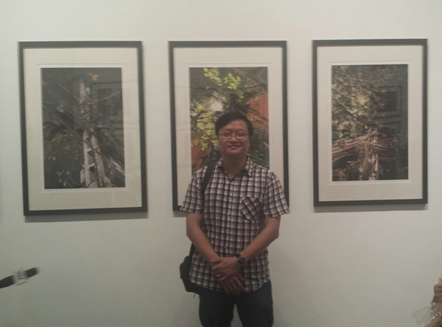 | Fotograf Nguyen The Son steht vor seinen Bildern, die in der Ausstellung vorgestellt werden. |