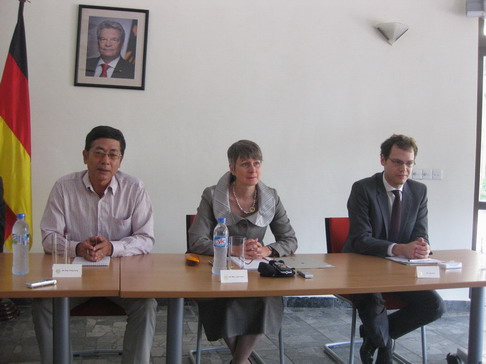 | Die deutsche Botschafterin Jutta Frasch und der erste Sekretär Jonas Koll (r.) auf einer Pressekonferenz in Hanoi. (Foto: VOVworld) |