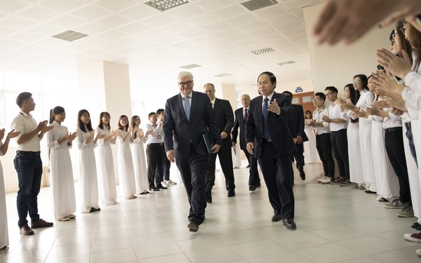 | Bundesaußenminister Frank-Walter Steinmeier (l.) wird vom Rektor Le Tien Chau (r.) und Studentinnen und Studenten der Rechtshochschule begrüßt. (Foto: Thomas Koehler/ photothek.net) |