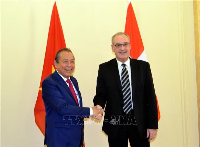 Vize-Premierminister Truong Hoa Binh und der Minister für Wirtschaft, Bildung und Forschung der Schweiz, Guy Parmelin, beim Treffen. (Foto: To Uyen/VNA) |