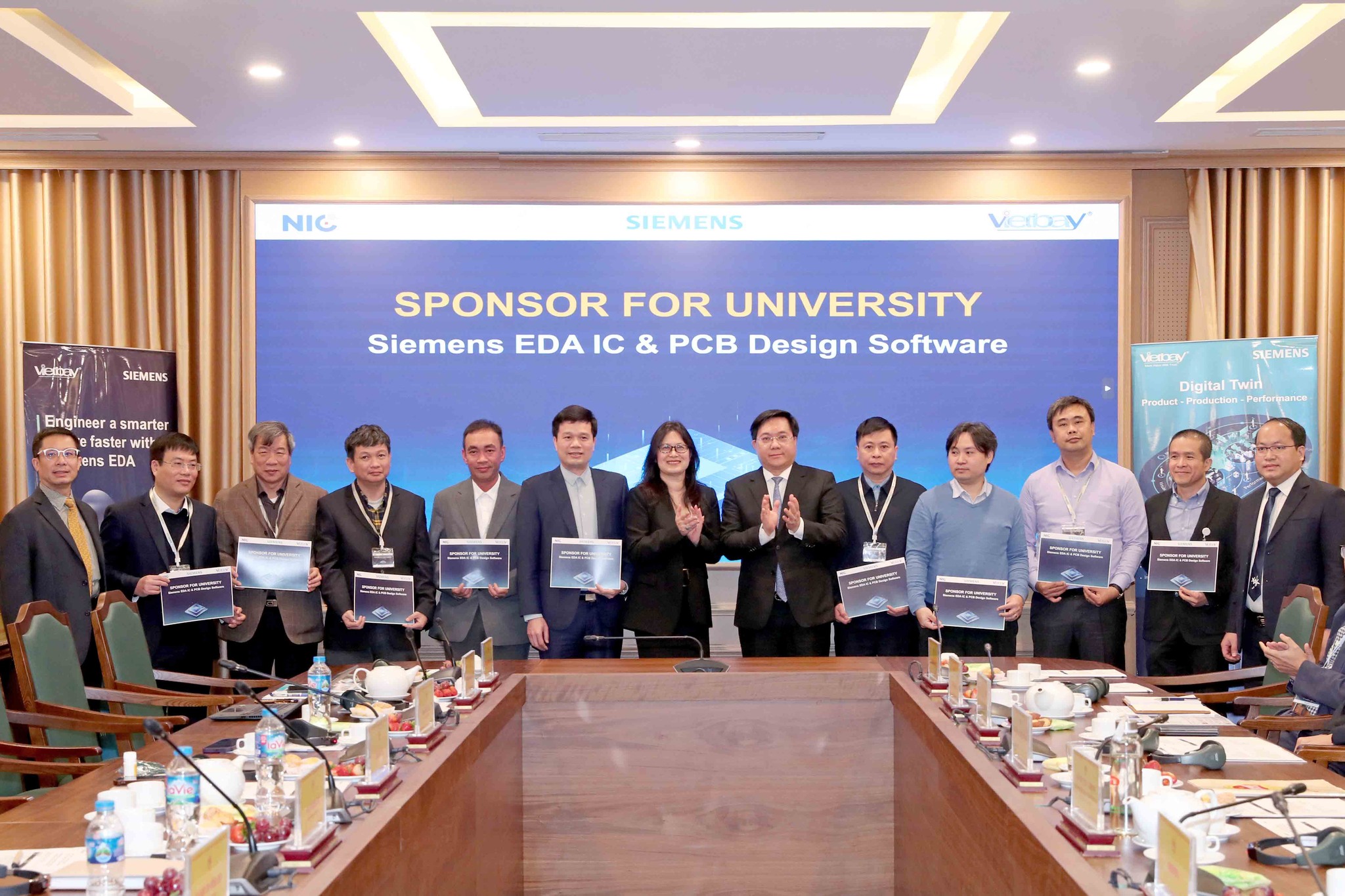 NIC and Siemens EDA present the sponsored software to universities tasked with training human resources for Vietnam's semiconductor industry. (Photo: NIC) |