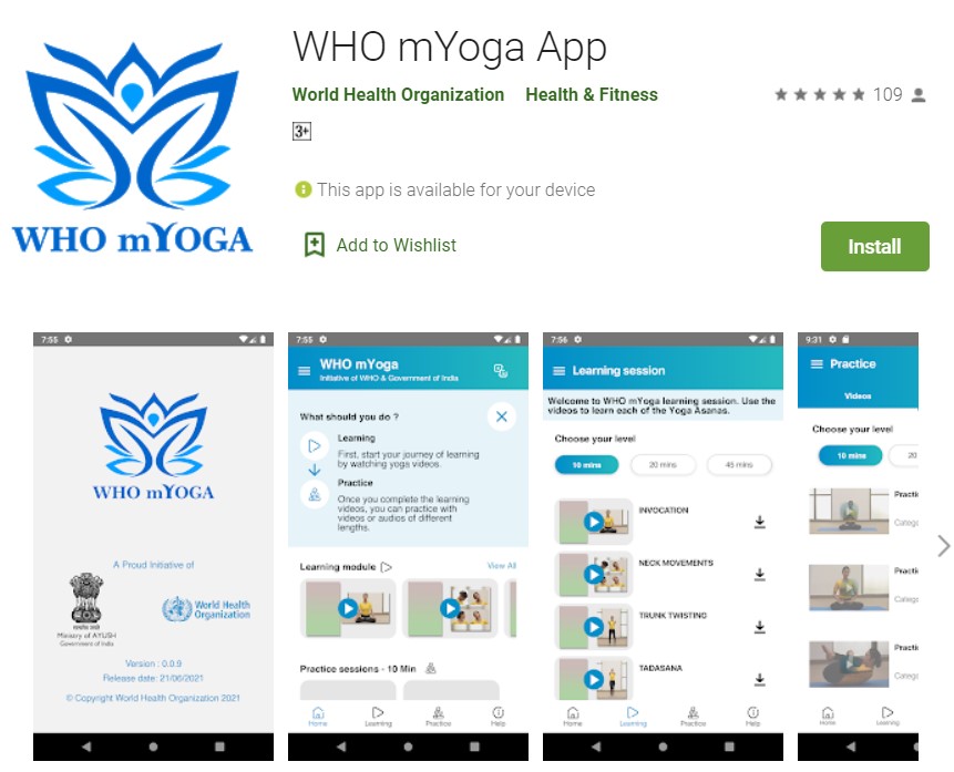 According to the World Health Organization, yoga is recognized as an accessible way to lead a physically active lifestyle. WHO mYOGA is an app for the general public to use regularly, providing WHO-approved Yoga and practice sessions in varying durations. The app was developed through review of scientific of literature and extensive international expert consultation processes. The app is safe and secure, collecting no data like phone numbers or emails from users at all, and can be used as a daily yoga companion for persons aged 12-65 years old. It is available in English, French, and in Hindi, with other UN languages following in the coming months.