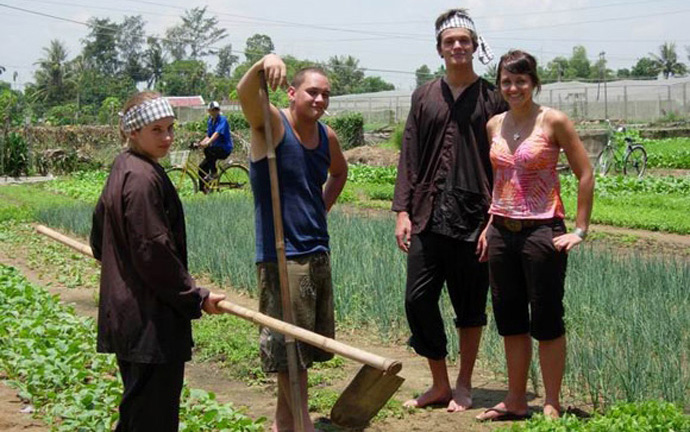 You can ride a bike from Hoi An to Tra Que village. For the past ten years, the villagers have been welcoming foreign tourists who come to experience farming work. Tra Que village which is famous for herbs grown with clean technology, is now a popular destination for tourists. Do Thi Thanh is a farmer in Tra Que: “Tra Que herbs are aromatic with small leaves. It takes us about 20 days to grow and harvest them. I grow vegetables for wholesale. I have been growing vegetables for more than 20 years. Herbs are often used with chicken rice, salads, mussels and eggs. Tourists come here to see and experience farm work. We teach them how to plough the soil, apply fertilizer and water the vegetables. Normally, it takes one hour to prepare the soil for a vegetable patch. The tourists are very excited and happy. They like doing this job”.