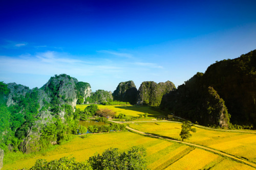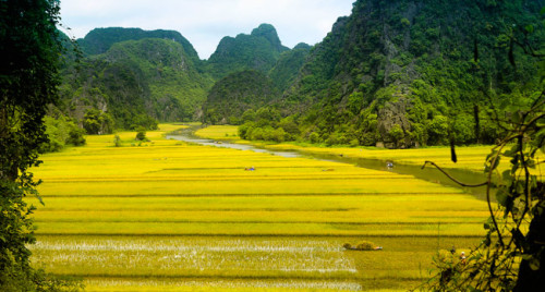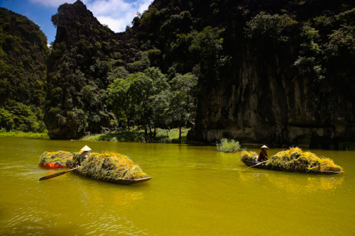 Tam Coc is charmingly beautiful in any season. In spring, bright green rice fields spread along the river banks, turning into silky yellow beds in the fourth lunar month. In the summer while traveling on the Ngo Dong River, visitors will enjoy an enticing lotus fragrance while listening to the locals recounting legends about each cliff or mountain in the shape of a tortoise or dragon head.