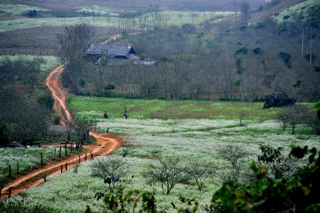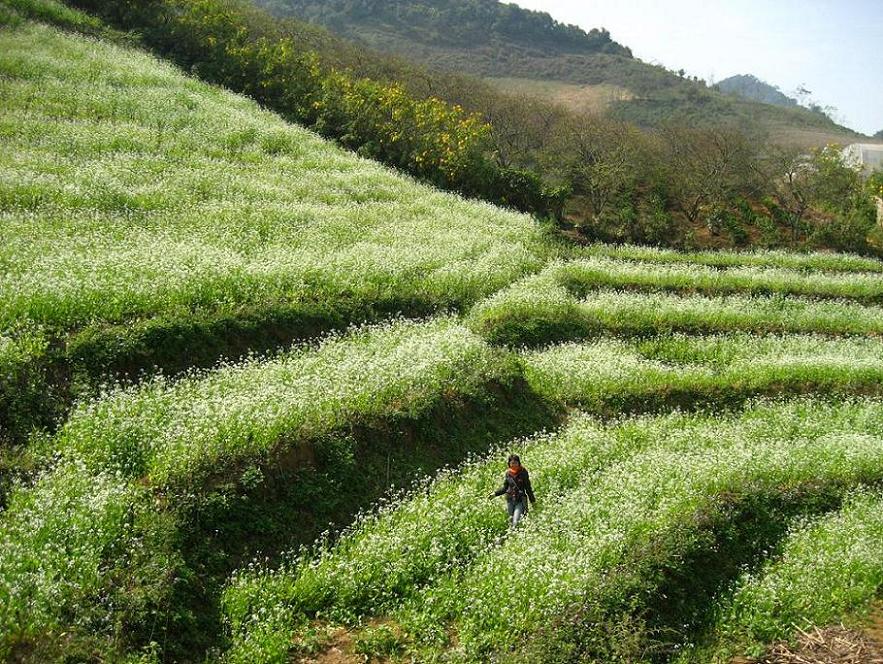 December is month that white mustard flowers bloom. The fields and hillsides around Moc Chau are covered with white mustard flowers, but the most beautiful area is beyond the Ban Ang pine forest. Dozens of hectares of white mustard flowers blend with pink peach flowers and green pine trees to create breathtaking scene. Phuong Thao who works for a travel company in Hanoi says: “I was extremely impressed by the landscape of mustard flowers in Moc Chau. Working for a travel company gives me many opportunities to explore beautiful landscapes and learn about local cultures. I decided to develop tours of Moc Chau flowers to let my clients experience the region, its landscape, culture and people”.