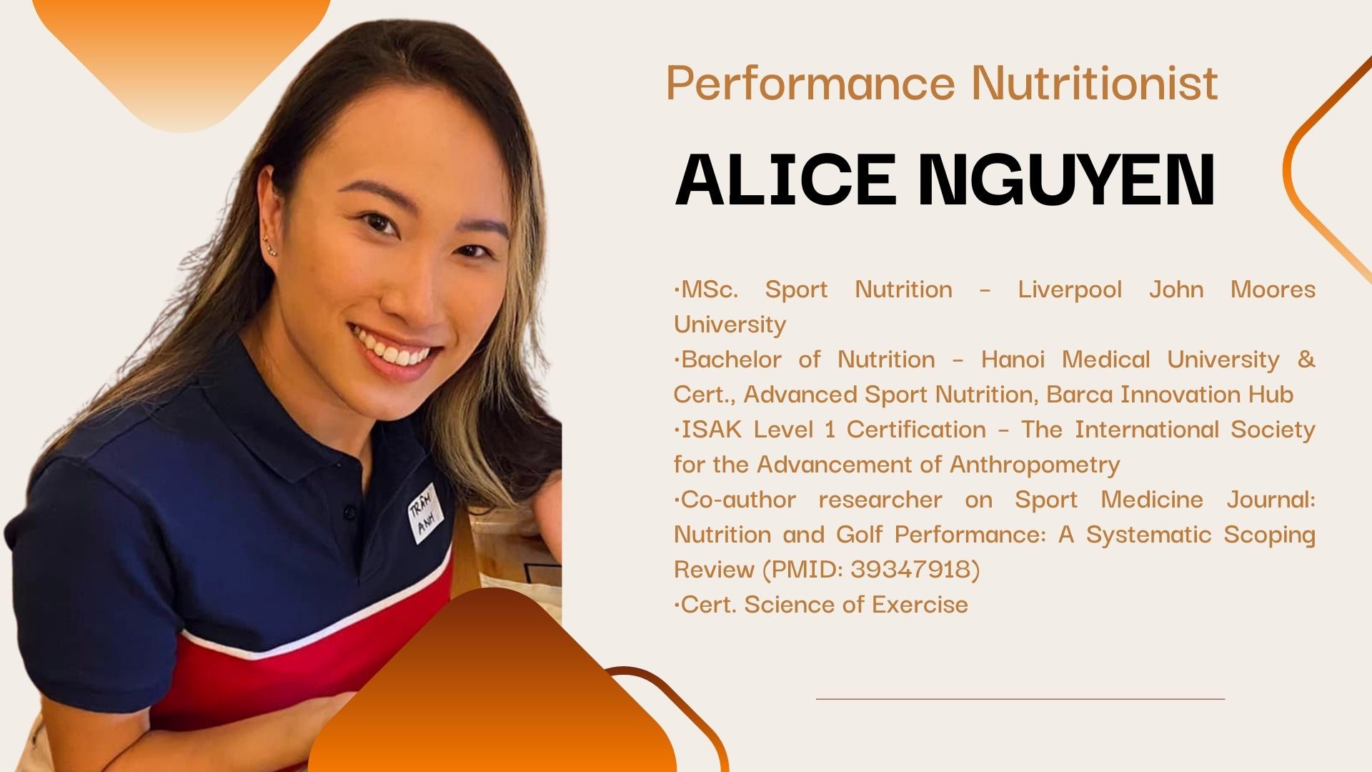 With over eight years of experience in sports nutrition, Alice Nguyen currently works as a sports nutrition consultant at Evolve Clinic in Ho Chi Minh City, supporting both active individuals and professional athletes. Her training includes a Master’s degree in Sport Nutrition from Liverpool John Moores University (UK) and a Bachelor’s degree in Nutrition from Hanoi Medical University, along with advanced certification from Barça Innovation Hub. She also holds ISAK Level 1 certification and a Certificate in the Science of Exercise, and has contributed to international research on nutrition and sports performance published in a leading sports medicine journal.