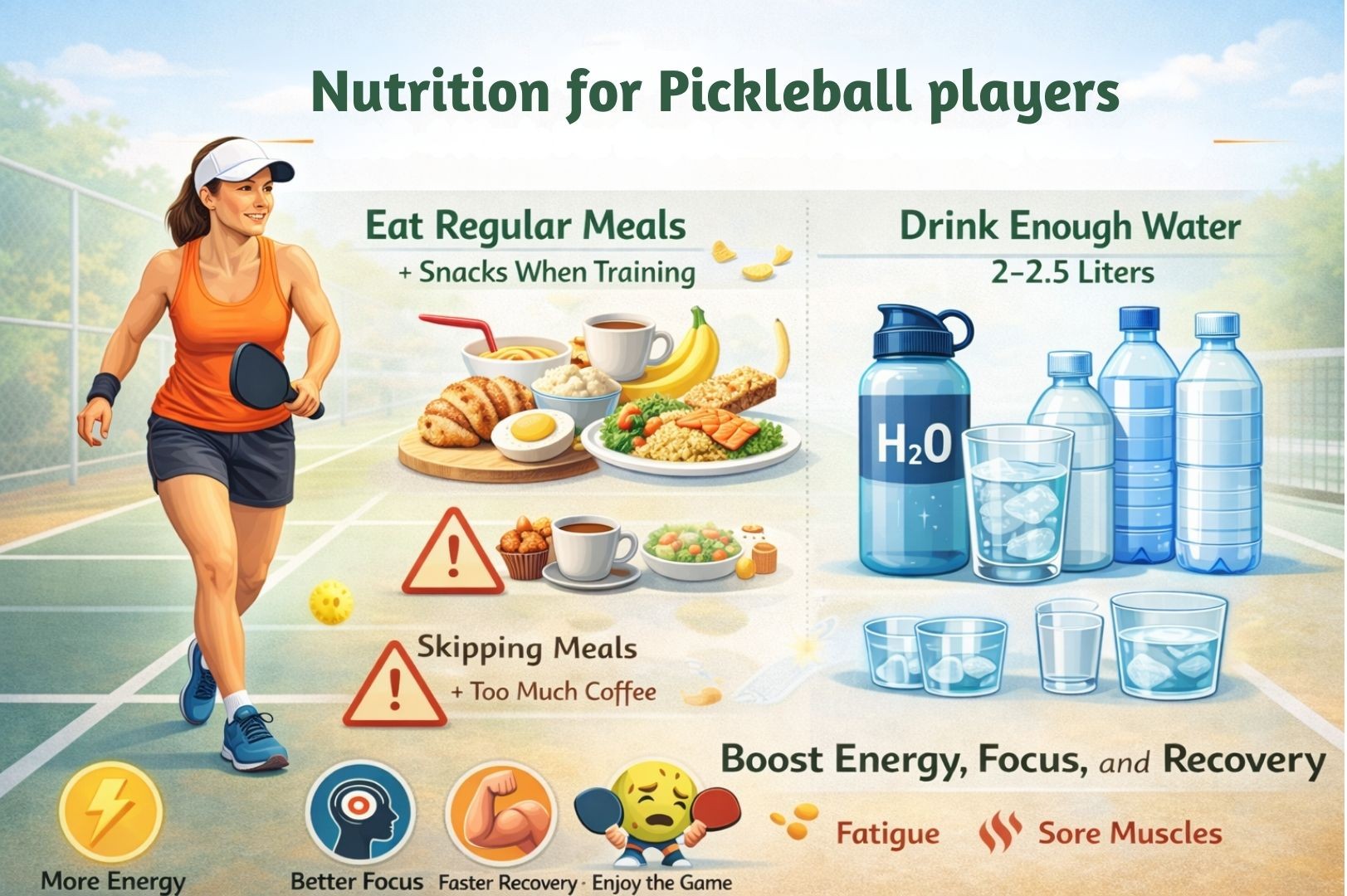 Alice: I’d suggest starting with regular meals and proper hydration. According to my observation with my friends who start doing sport, not just Pickleball, they usually undereat a lot and they rely on coffee to help them to be energized. And at the same time, they are not drinking enough water. So if you're not eating and providing water for your body, which is actually the basic need of the body, so your body will take a longer time to recover from the soreness from the previous sessions. You can very easily get tired on the court and some people might get sick after the hard day of training or training in high temperatures. So that is all the signs of under recovery and under eating and poor hydration when you start playing some sport. So my suggestion is quite simple. It's just eating three to four meals per day, including some snacks before the training, and drinking enough water, like two to two point five liters per day at least. So hydration and adequate filling can immediately improve your energy, focus, recovery and enjoyment of the game.