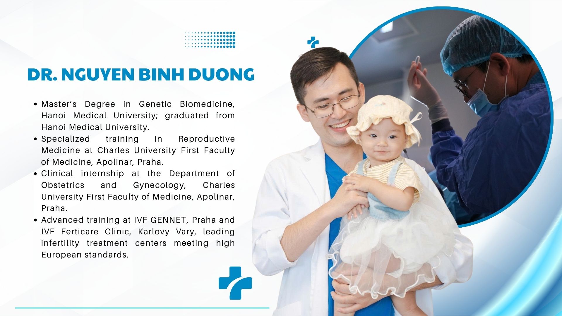 Dr. Nguyen Binh Duong is Head of the Center for Reproductive Medicine and Infertility at Hong Ngoc–Phuc Truong Minh General Hospital. He earned his medical degree from Hanoi Medical University and holds a master’s degree in Genetic Biomedicine. He received specialized training in reproductive medicine at Charles University’s First Faculty of Medicine (Apolinar), Prague, where he also completed clinical internships in obstetrics and gynecology. Dr. Duong later undertook advanced training at IVF GENNET in Prague and IVF Ferticare Clinic in Karlovy Vary, two leading European centers for infertility treatment that operate under high clinical and laboratory standards.