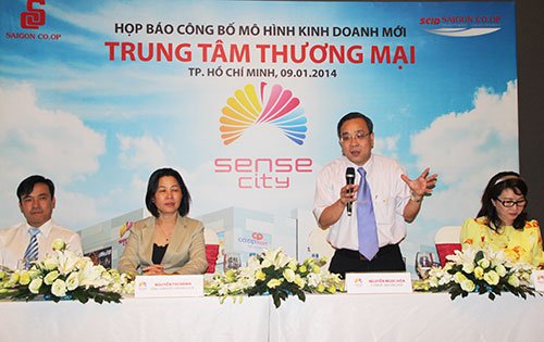 ![]() Nguyen Ngoc Hoa (standing), chairman of Saigon Co.op, announces the Sense City model on Thursday - Photo: Hung Le