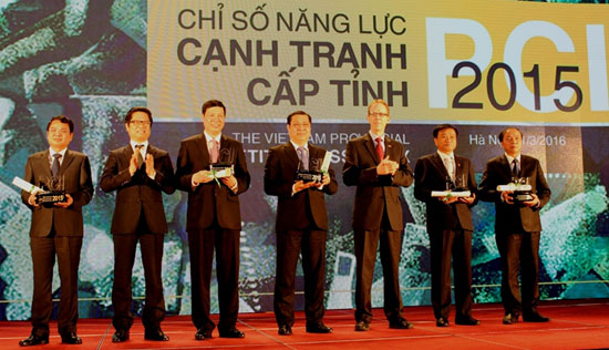 | Representatives of top 5 provinces received PCI 2015 certification. (Photo: hanoitimes.com.vn) |