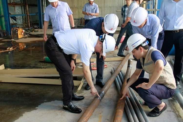 General Director Hung inspects the pipes used in the desulfurisation system. |