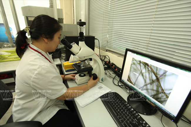 | Analysing the fibers at the Ho Chi Minh City’s Textile Research Sub-Institute. |