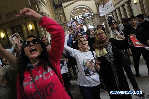 | Supporters of Egypt’s former president Hosni Mubarak chant slogans at a court in Cairo, Egypt, on Nov. 5, 2015. (Photo: Xinhua) |