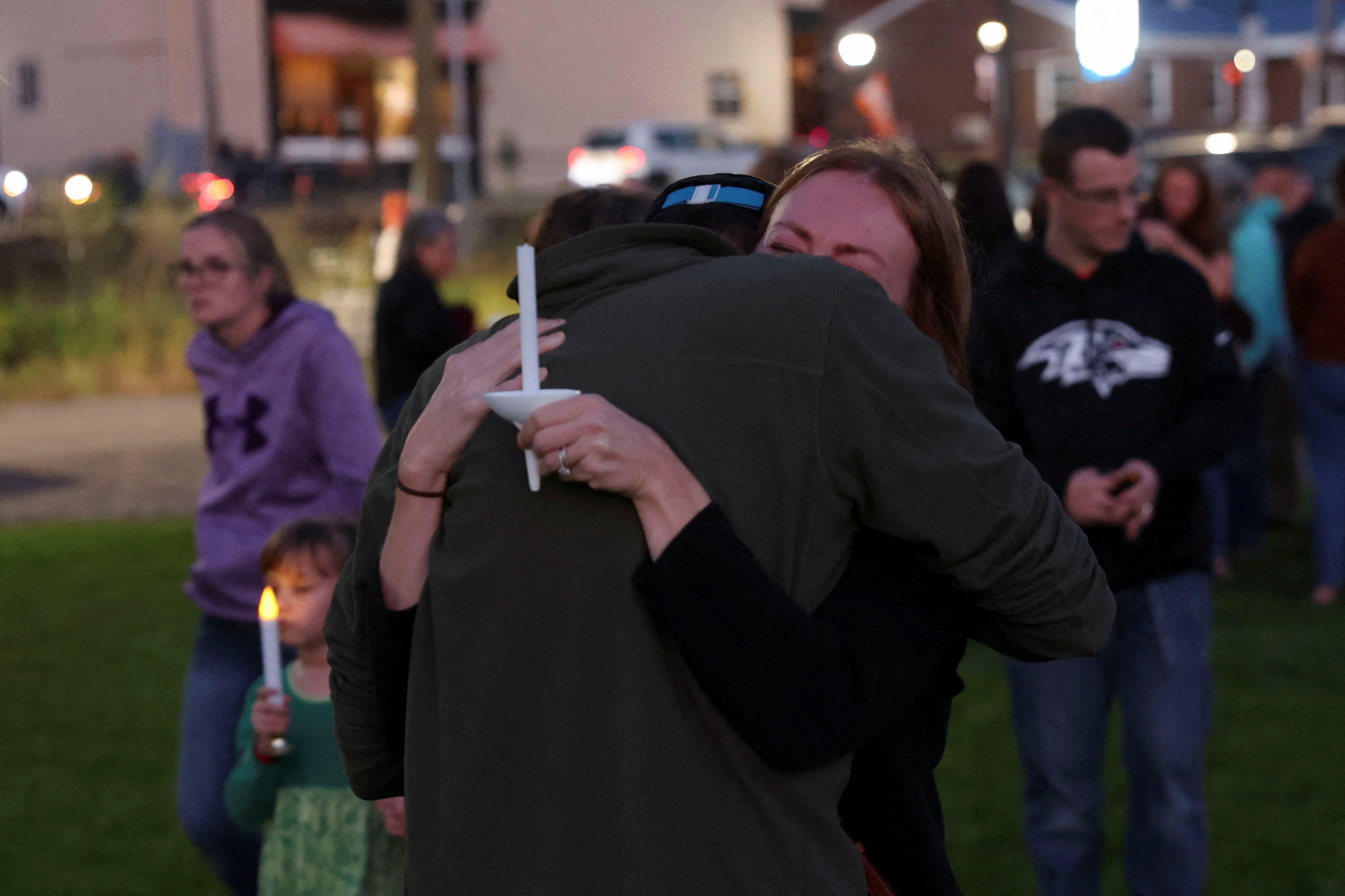 People embrace during a candlelight vigil for victims of the Lewiston mass shooting, in Lisbon, Maine, US, October 28, 2023. (Photo: REUTERS/Shannon Stapleton)