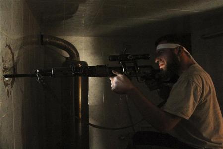 A member of the Free Syrian Army points his weapon through a hole in a wall as he takes up a defensive position during clashes with forces loyal to Syria's President Bashar al-Assad in Aleppo's Salaheddine district, April 30, 2013. Credit: Reuters/Malek Alshemali