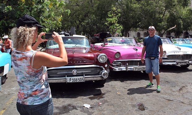 Tourists take pictures next to some classic vehicles in a Havana street in Cuba earlier this month (Photo: EPA) |