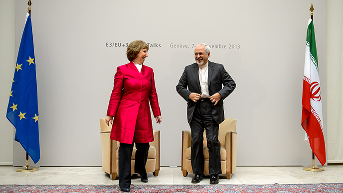 | EU foreign policy chief Catherine Ashton speaks with Iranian Foreign Minister Mohammad Javad Zarif on November 7, 2013 before the start of the closed-door nuclear talks in Geneva. (Photo: AFP) |
