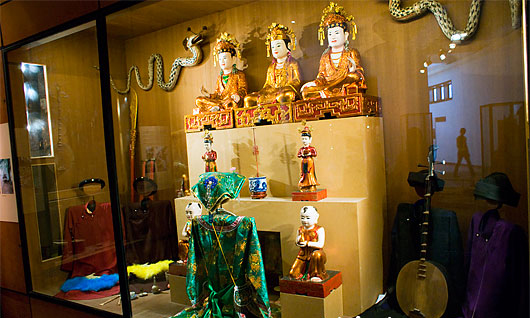 En cada vivienda, el altar de los antepasados se ubica en la sala principal. El culto a los ancestros es una creencia peculiar de los Viet, explicó Minh Nguyệt, quien explicó también sobre la arraigada tradición de “Thờ Mẫu”, o culto a la Madre, pues la madre desempeña un papel importante en cada familia. “Tres estatuas expuestas aquí simbolizan a 3 Madres Santas que administran 3 territorios diferentes. La Madre Thiên Tiên goberna el cielo, la Thượng Ngàn las zonas montañosas, y la Madre Thoải administra la tierra y el agua.”