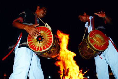 En la luz de la hoguera, los percusionistas Cham H’Roi aportan a