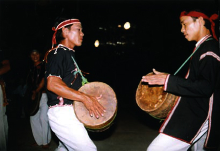 Cuando se interpreta el dúo de un chico y una chica se lleva en hombro un tambor y se baila al ritmo acompasado por la misma pareja. Los sonidos melodiosos y el cambio de tono provocan en los espectadores diversas fantasías como el murmullo de arroyos, el parpadeo de llamas y la corriente rápida de las inundaciones y cascadas. Además, al tocar tambor a dúo, se puede transmitir signos expresivos en los diálogos representados por la percusión de sus instrumentos musicales. Por eso, para interpretar correctamente el tambor a dúo, se necesita una pareja que tenga una buena compresión mutua para garantizar una completa y jubilosa armonía. El artista Oi Thu informó: “Se toca de modo rotativo el tambor a dúo toda la noche en el rito de sacrificio de búfalo. En la ceremonia de construcción de hitos para el rito de sacrificio de búfalo, unos hombres tocan el tambor y los demás bailan. Por su parte, las mujeres atienden a los hombres ofreciéndoles bebidas alcohólicas”.